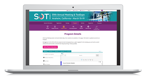 Customize your schedule by saving events, posters, and sessions of interest to you. You also can build your schedule with the Online Planner on the Annual Meeting website, and it will synchronize with the SOT Event App once you log in to the app.